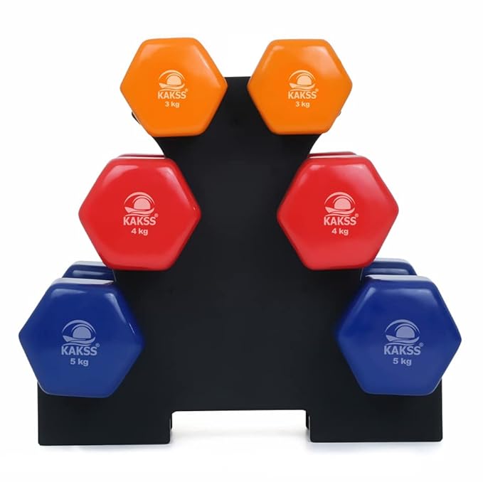 - Packaged content includes a Piece of 6 cast iron Vinyl-coated dumbbells in 3 weight categories (3Kg Orange, 4Kg Red, 5Kg Blue), with a Dumbbell storage stand